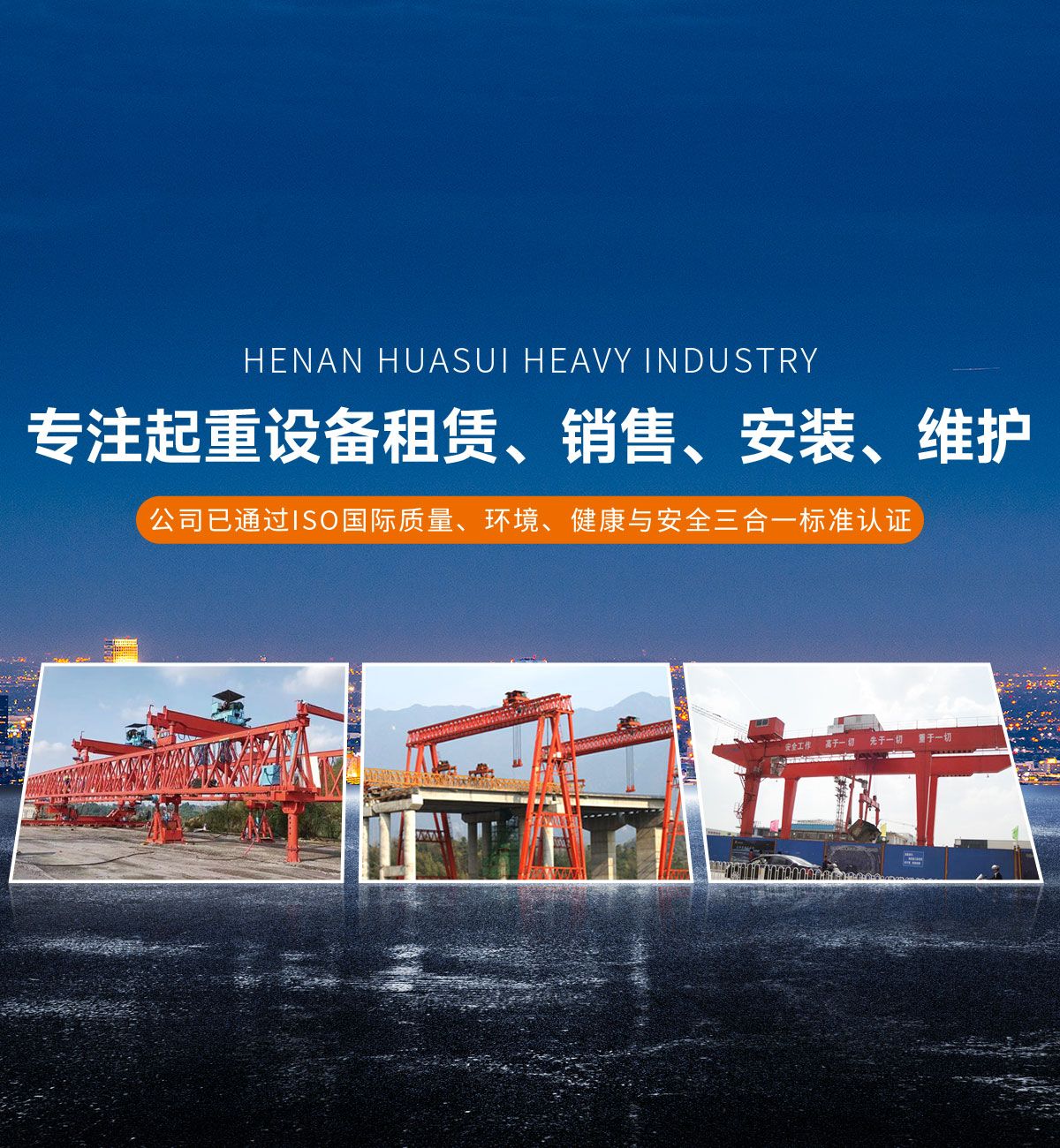 河南華隧重工機械裝備有限公司主要從事通用門式起重機、橋式起重機、電動單梁起重機,輪胎式起重機、架橋機、提梁機、遠梁平車、鋼絲繩電動萌蘆、卷揚機、起重配件制造、銷售:起重機械租賃、安裝和維修,起重設備園收,機械設備維修,鋼結構工程承包,橋梁工程及技術咨淘服務,銷售五金制品、機電設備:建設工程監理,建設工程設計,各類工程建設活動,建筑勞務分包,建筑物折除作業,施工作業,工程管理服務,土石方工程施工,裝如發運?! 」疽淹ㄟ^IS0國際質量、環境、健康與安全三合一標準認證,特種設備制造許可證和特種設備安裝改造維修許可證。擁有完熟的質量管理體系。嚴格的管理制度,強大的生產能力和先進的檢測手段,在保證產品質量的同時,也具備了極強的市場競爭力?! 」緢猿挚萍紕撔聻槔砟睿a品質量為核心,注重信譽,建立了減信可靠、快捷、思速。便利周到的售后服務網絡?! ∥覀儞碛械募夹g專家和技術服務隊伍為客戶提供充善的售前技術支持和全天候的售后服務體系,讓您無后顧之憂,享受一站式的超值服務?!  叭A隧重工,伴您成功“是華隧重工永遠的宗指,真被的希望與各界朋友攜手并進。共創輝準!